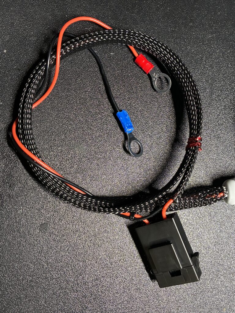 Kabel zasilający posiada silikonową izolację, dzięki czemu jest odporny na wysokie temperatury. Dodatkowo elastyczna osłona kabla zapewnia wygodę podczas instalacji, a jego długość około 1 metra umożliwia montaż bezpośrednio od akumulatora nawet na odległość do 1 metra.